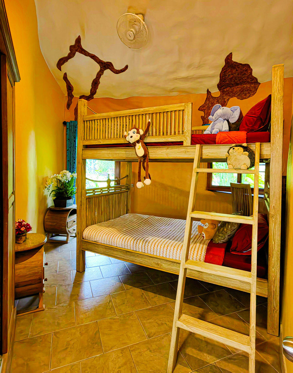 Introducing Goya, an extraordinary two-level treehouse unit that transports you to a world of enchantment. Featuring four bedrooms, with two on the lower level each having their own private bathroom, and loft-style upper-level bedrooms accommodating up to four people each, Goya offers ample space for a memorable stay. A central bathroom with a toilet caters to all guests. The spacious terrace within the lake provides panoramic views and a wooden covered sitting hut, perfect for relaxation. Enchanting fairy tale wall paintings add whimsy and charm. Accommodating up to eight people, Goya ensures a spacious and magical stay for all guests.