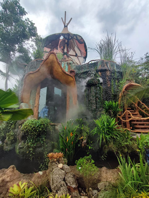Experience the soothing ambiance as water cascades from the rooftop pool, flows down the verdant walls, and meanders through a circular canal, complete with a grand fish pond and a striking volcanic fountain. This workspace seamlessly blends ergonomic design with a touch of Jugendstil, showcasing graceful curves, artistic wall and ceiling paintings, and tree-inspired pillars adorned with smooth rock textures.